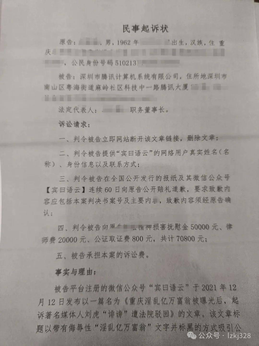 2021年12月12日,宾曰语云转发一篇多家官媒曾发表过的《重庆淫乱亿万富翁被曝光后,起诉著名媒体人刘虎“诽谤”遭法院驳回》的文章。三年后,我被重庆亿万富翁“何善良”(化名)告上法庭,请求法院判令我在全国公开发行的报纸和微信公众号上连续60日公开赔礼道歉,赔偿精神抚慰金、律师费、公证取证费共计70800元。