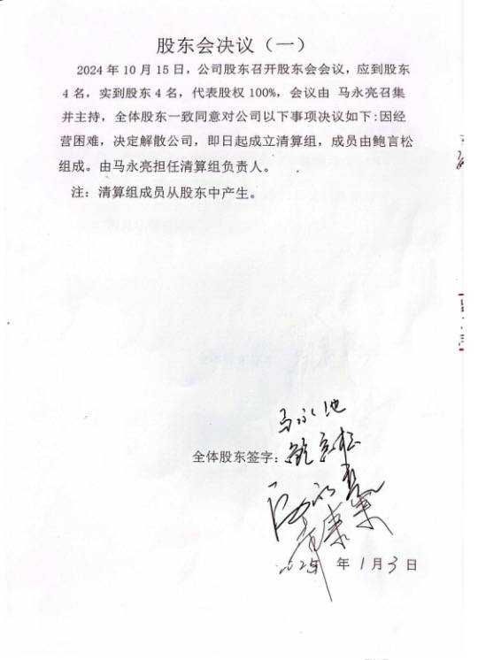 物证A:伪造的《股东会决议》(两份)——这两份决议声称全体股东一致同意解散公司并进行清算。然而,决议上“马永池”的签名,我在此以人格和法律责任郑重声明:绝非我本人所签,也从未授权任何人代签,系彻头彻尾的刑事伪造。一个明显的事实是,这个伪造的签名中我的名字也被签错了,“驰”字被签成了“池”字。我强烈要求并恳请公安机关立即启动司法鉴定程序,对该签名进行笔迹鉴定,以锁定犯罪证据。