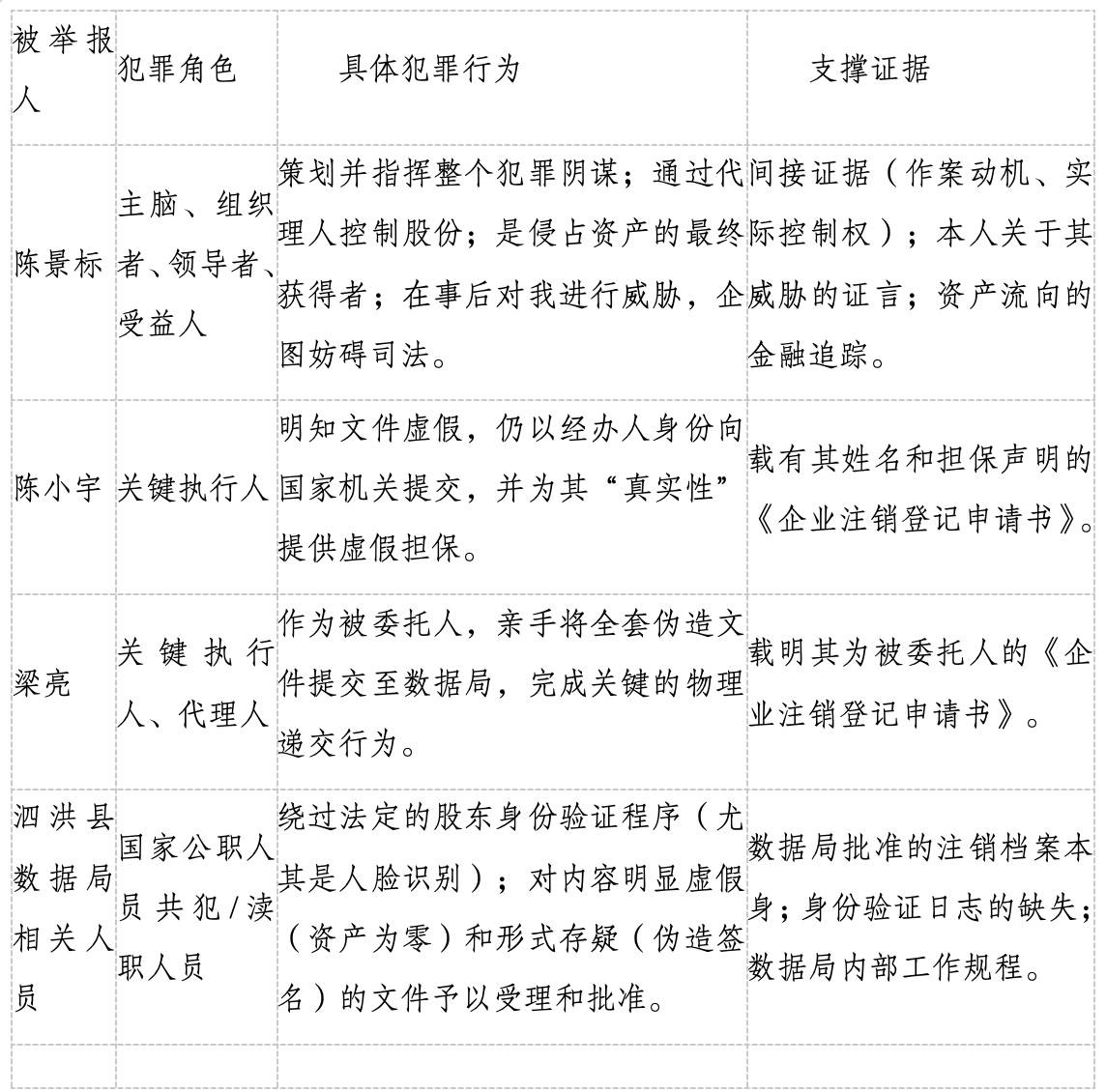 本人马永驰,以中华人民共和国公民和受害者的双重身份,现依法对以陈景标为首的犯罪团伙进行实名举报和控告。该团伙涉嫌通过伪造文件、虚假清算等手段,非法注销资产近亿元的民营企业,并侵吞全部资产,其行为已构成特大职务侵占罪、伪造公文印章罪、诈骗罪。