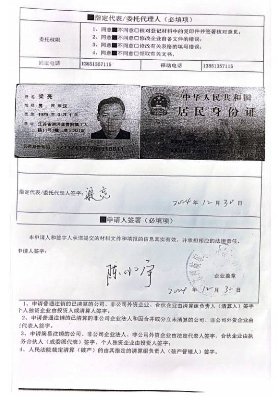 物证C:《企业注销登记申请书》 这份申请书直接锁定了犯罪行为的执行人。文件上明确记载:梁亮为本次注销的“被委托人”,而陈小宇则以经办人身份,对所提交的全部文件(包括上述伪造的决议和虚假的报告)的“真实性、合法性和有效性”承担法律责任。陈小宇的这一“担保”,在事实面前,无异于一份自证其罪的供状,他明知文件虚假仍向国家机关作保,已构成诈骗罪的共犯。