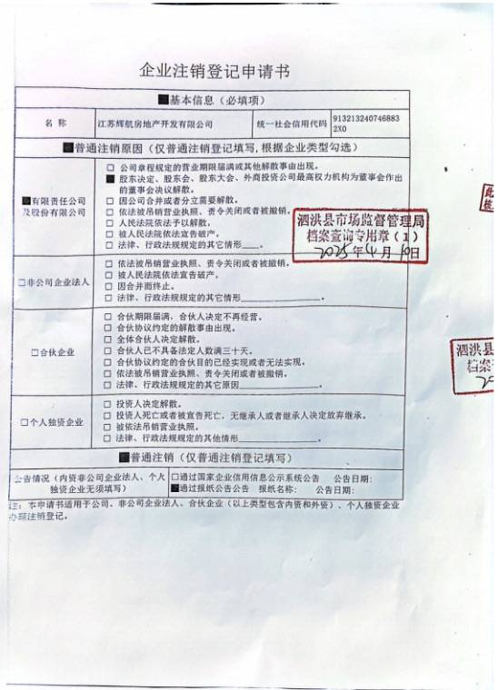 2025年4月,我偶然听闻辉航公司已被注销。我本人作为持股38%的大股东,公司从未召开过任何形式的股东会讨论解散事宜,更未对近亿元的资产进行任何清算分配,公司怎么可能被注销?我怀着巨大的疑问,立即前往泗洪县数据局,依法调取了公司的工商登记档案。眼前的一幕令我震惊——辉航公司确实已被非法注销。