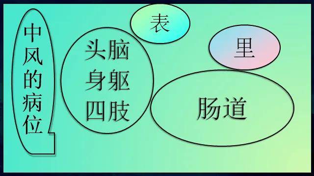 概括一下,中风的病位在哪里?在头、脑、身躯、四肢,肠道;头、脑、身躯、四肢为表,肠道为里;所以,中风就是表里同病,而以表为所急所苦。