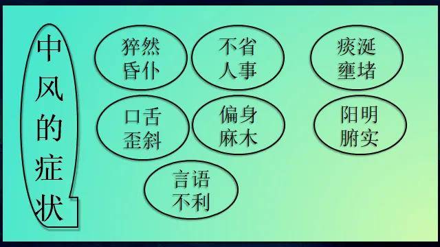 中风的症状:猝然昏扑、不省人事、痰涎壅堵、口舌歪斜、偏身麻木、阳明腑实、言语不利。