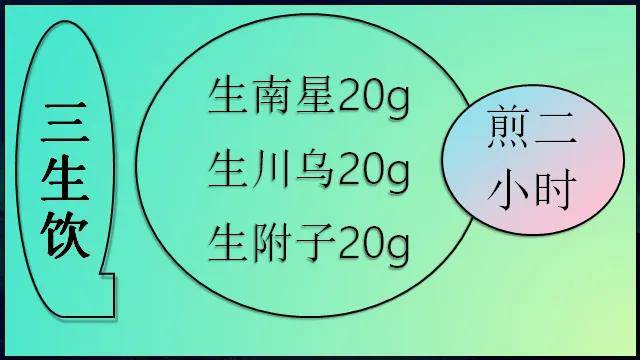 前面说过,服药要在24小时内。三生饮煎两小时,甚至煎三小时——一定要把它煎透,煎透了以后,它就是好药;这个备药时间都在24小时内。生南星、生川乌、生附子在网上都能买到。
