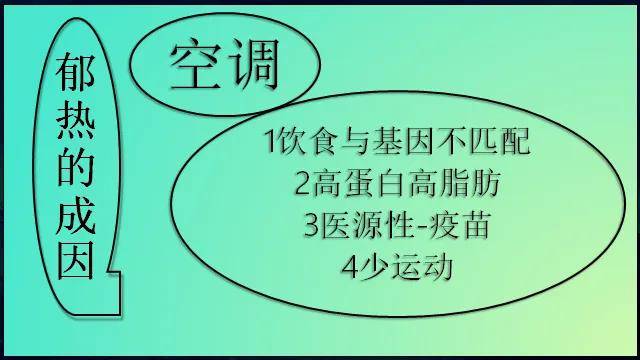 中风的郁热是怎么来的?这个郁热,首先是感受了风寒,比如夏天吹空调;其次是饮食与基因不匹配、高蛋白高脂肪、医源性因素-疫苗、运动少。