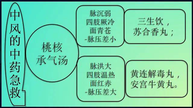 鉴于目前中风是一个常见多发病,并且呈年轻化趋势,10多岁、20多岁、30多岁得中风的比比皆是,而且年轻人中风的比例甚至高于老年人了。所以,建议家里储备一、二颗安宫牛黄丸和苏合香丸,这两个药是救急的中成药。苏合香丸对寒痰阴证有用,安宫牛黄丸对热证有用。中风的急救办法就是桃核承气汤喝下去,再送服寒证的苏合香丸或热证的安宫牛黄丸和黄连解毒丸。