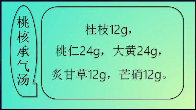 桃核承气汤:桂枝12g,桃仁24g,大黄24g,炙甘草12g,芒硝12g。