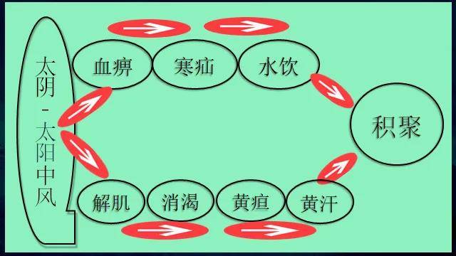 上边一条线是寒线(寒证)的传:太阳中风传到表部,引起表部的血脉不通,酸麻胀痛——颈、肩、腰酸麻胀痛、头痛,这叫血痹;血痹在表,往里传,传到肚子内,传到五脏,叫寒疝(shàn);疝就是在里部,坚硬、卡住了,不能流通,叫寒疝。寒疝是已经传到里部了,那么传到里部了以后,有寒,不通,就会出现水饮。有些女孩子假如有痛经,往往伴随有盆腔积液,盆腔积液是水饮,寒疝是寒痛,这就是寒疝传水饮。有了盆腔积液,又有了寒性,那么它就容易传子宫肌瘤、传肿瘤、传癌症,这叫传积聚,这就是寒线的传。