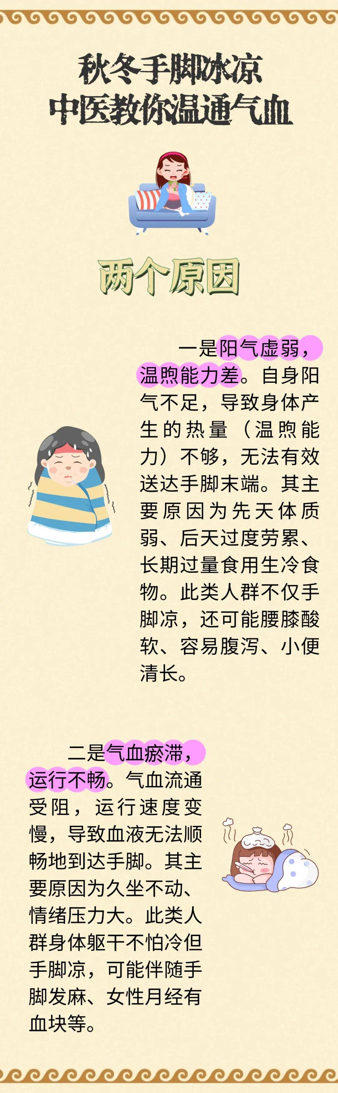 秋冬季节气温下降,不少人会出现手脚冰凉的情况,即使穿再多衣服,手脚也难捂热,甚至伴随怕冷、易疲劳、精神不振等问题。从中医角度来看,这多与阳气不足、气血不畅密切相关,通过针对性调理可有效改善。