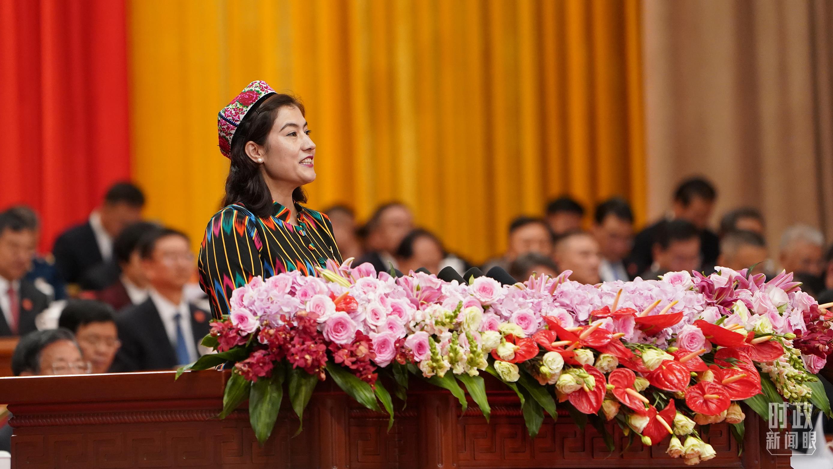 喀什地区巴楚县童梦幼儿园园长艾米拉古丽·阿不都作为维吾尔族群众代表发言。她曾见证了自己所在的幼儿园由低矮的土坯房变成标准化幼儿园,成为乡村最漂亮的建筑。