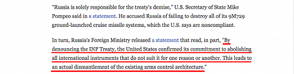 美国政府指责俄罗斯对于该条约的瓦解“负有全部责任”。对此,俄罗斯外交部回应称“美国宣布退出《中导条约》证明其会用一个个借口废除所有不合其意的国际条约。美国此举将导致现有军控体制开始真正瓦解”。