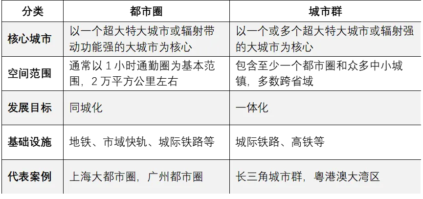 都市圈一般只有一个中心城市,以1小时通勤圈为范围;城市群多数涵盖多个都市圈,范围普遍跨越省域。