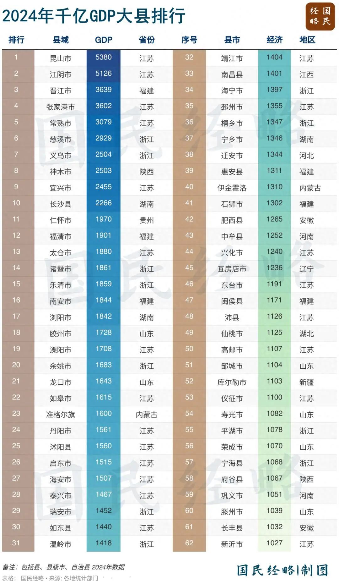 我国既有“富可敌市”的千亿经济大县。2024年,千亿GDP县增加到62个,主要集中于江苏、浙江、山东、福建等东部地区。