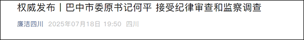 四川省纪委监委微信公众号“廉洁四川”7月18日消息,中央纪委国家监委网站援引四川省纪委监委消息通报称:四川省巴中市委原书记何平涉嫌严重违纪违法,目前正接受四川省纪委监委纪律审查和监察调查。