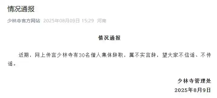少林寺管理处8月9日通报称,近期,网上传言少林寺有30名僧人集体辞职,属不实言辞,望大家不信谣、不传谣。