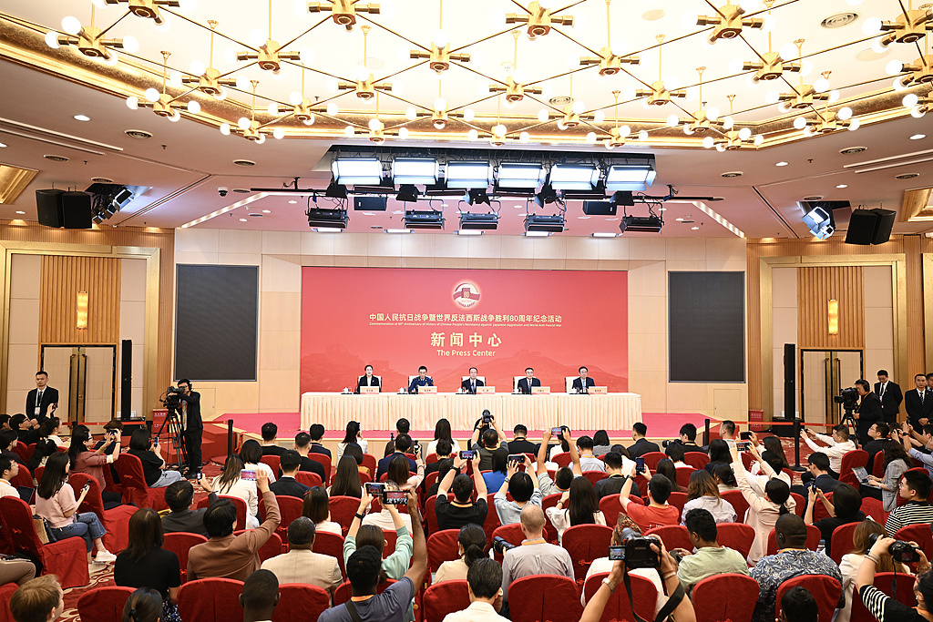 28日,中国人民抗日战争暨世界反法西斯战争胜利80周年纪念活动新闻中心在位于北京的梅地亚新闻中心举办第一场记者招待会。(中新社)