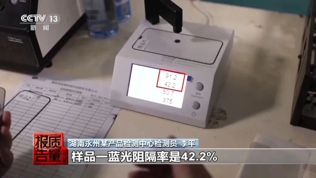 记者选取了其中2个作为样品,通过蓝紫光测试仪检测其实际防护效果。湖南永州某产品检测中心检测员李平称,样品一蓝光阻隔率是42.2%,透光率是91.2%;另外一款蓝光阻隔率是52.1%,紫外阻隔率是61.2%。