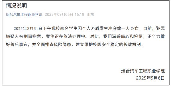 2025年8月31日下午我校两名学生因个人矛盾发生冲突致一人身亡。目前,犯罪嫌疑人被刑事拘留,案件正在依法办理中。对此,我们深感痛心和惋惜,正全力做好善后事宜,并全面排查风险隐患,建立维护校园安全稳定的长效机制。