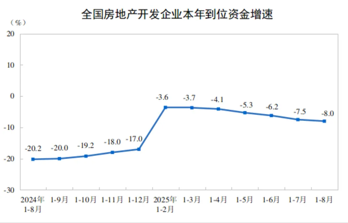 1—8月份,房地产开发企业房屋施工面积643109万平方米,同比下降9.3%。其中,住宅施工面积448460万平方米,下降9.6%。房屋新开工面积39801万平方米,下降19.5%。其中,住宅新开工面积29304万平方米,下降18.3%。房屋竣工面积27694万平方米,下降17.0%。其中,住宅竣工面积19876万平方米,下降18.5%。