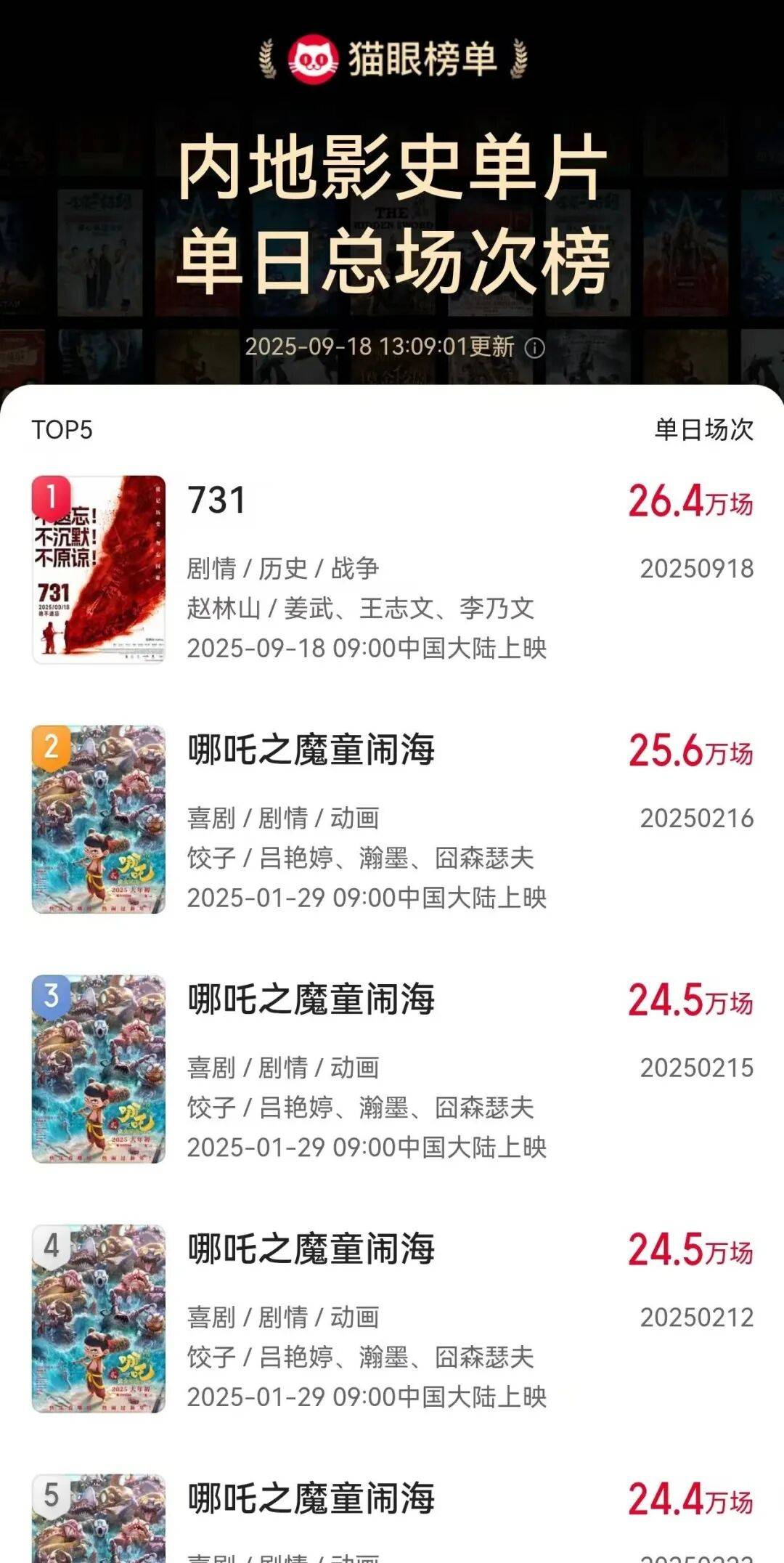 据猫眼专业版数据,电影《731》9月18日单日场次破26.4万场,超《哪吒之魔童闹海》,成中国影史单片单日总场次冠军!
