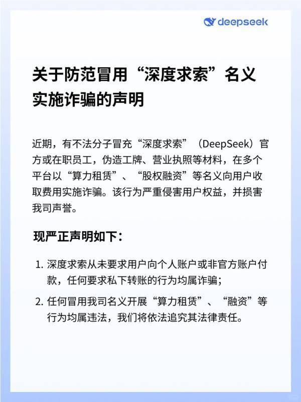 近期,有不法分子冒充“深度求索”(DeepSeek)官方或在职员工,伪造工牌、营业执照等材料,在多个平台以“算力租赁”、“股权融资”等名义向用户收取费用实施诈骗。该行为严重侵害用户权益,并损害我司声誉。