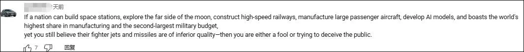 还有人写道:如果一个国家能够建造空间站、探索月球背面、建设高速铁路、制造大型客机、开发人工智能模型,并拥有世界最高的制造业份额和第二大军事预算,但你仍然认为他们的战斗机和导弹质量低劣——那么你要么是个傻瓜,要么就是在试图欺骗公众。