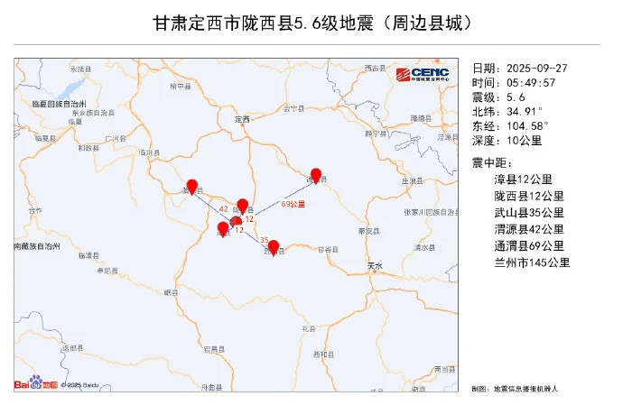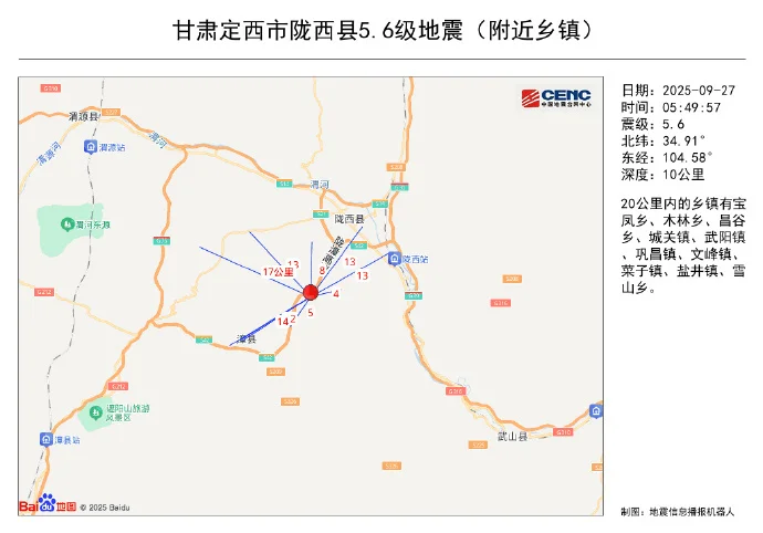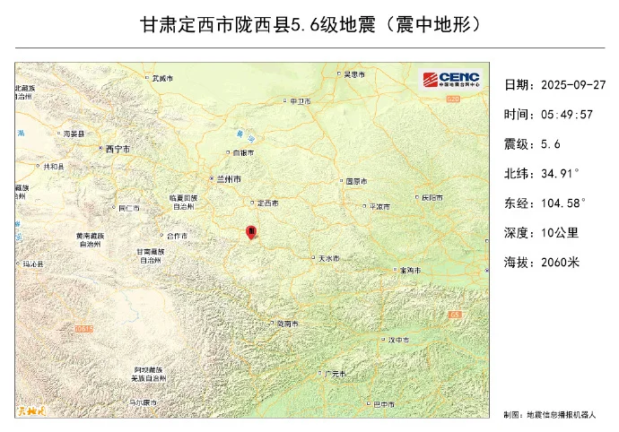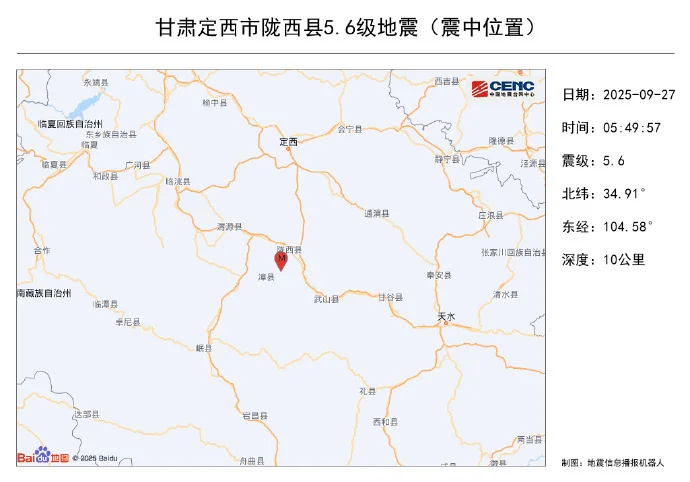 中国地震台网正式测定:09月27日05时49分在甘肃定西市陇西县(北纬34.91度,东经104.58度)发生5.6级地震,震源深度10千米。