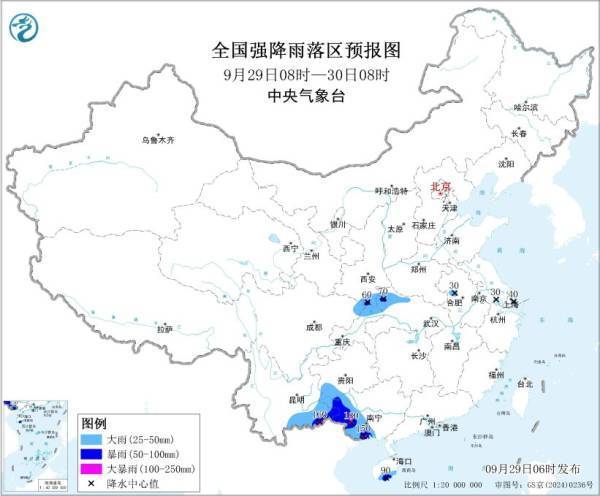 预计,9月29日08时至30日08时,四川东部、重庆北部、陕西东南部、湖北西北部以及海南岛南部、广西西部、云南东南部、贵州南部等地有大到暴雨,其中,广西西南部、云南东南部等地部分地区有大暴雨(100~180毫米)。上述部分地区伴有短时强降水(最大小时降雨量30~50毫米,局地可超过60毫米),局地有雷暴大风等强对流天气。