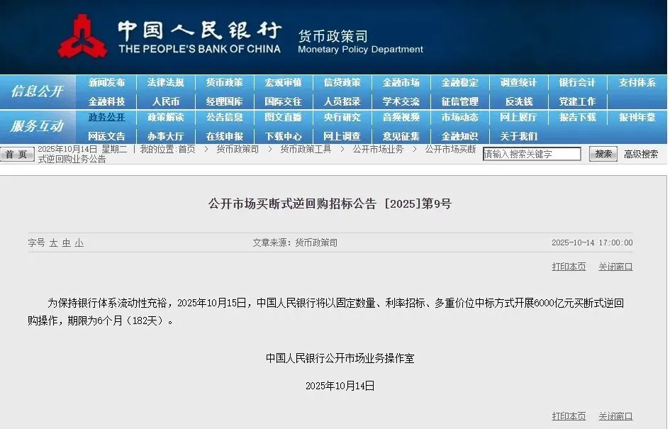 中国人民银行(下称央行)10月14日发布预告称,将在15日以固定数量、利率招标、多重价位中标方式开展6000亿元6个月期买断式逆回购操作。综合10月操作量与到期量看,央行完成本次操作后当月买断式逆回购将累计净投放4000亿元,也意味着央行买断式逆回购连续五个月加量续作。