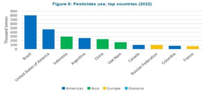 联合国粮食组织(FAO)发布的2022年全球农药使用量情况,中国以20多万吨的用量仅列第五