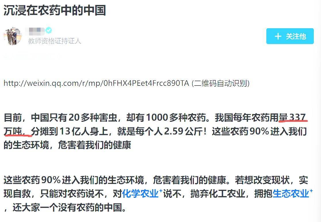 上一段还在说中国每年农药用量337万吨,得出全世界一半农药用在了中国的结论,下一段却又说全球农业生产每年要使用约350万吨农药。所以说“337万÷350万=50%”这般颠覆数学规律结论是怎么得出来的?还是说当事人在数据上已经做好造“96.3%”的谣,但基于良心发现还是给我们打了个折?