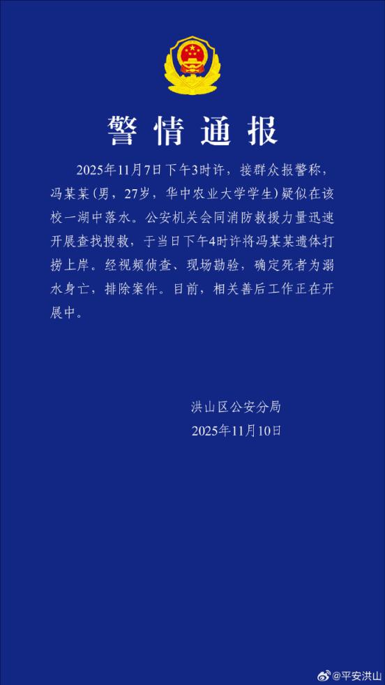 11月7日下午3时许,接群众报警称,冯某某(男,27岁,华中农业大学学生)疑似在该校一湖中落水。公安机关会同消防救援力量迅速开展查找搜救,于当日下午4时许将冯某某遗体打捞上岸。