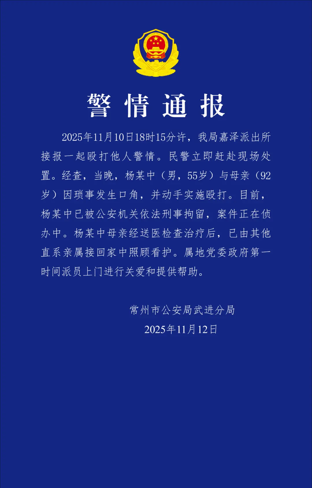 11日下午,武进区嘉泽镇人民政府通报:2025年11月10日18时16分,嘉泽所接到殴打警情,民警立即赶赴现场,了解到杨某中与其母亲陈某琴因琐事发生口角后动手殴打。目前,杨某中已被抓获,具体案情正在侦办中。嘉泽镇妇联、派出所已派专人进行上门服务,一旦老人有需求将及时对接解决。