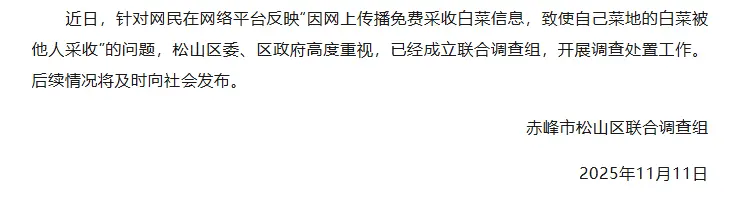 11日晚,赤峰市松山区发布情况通报,称针对网民在网络平台反映“因网上传播免费采收白菜信息,致使自己菜地的白菜被他人采收”的问题,松山区委、区政府高度重视,已经成立联合调查组,开展调查处置工作,后续情况将及时向社会发布。