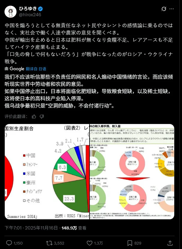 日本有个大V名叫西村博之,他16日发了个帖子,在社交媒体X上达到百万以上的阅读,非常火,转发就有3000多。帖子的内容对日本人来说属于振聋发聩的,西村博之写道:“我们不应该听信那些不负责任的网民和名人煽动中国情绪的言论,而应该倾听现实世界中劳动者和农民的意见。如果中国停止出口,日本将面临化肥短缺,导致粮食短缺,以及稀土短缺,这将使日本的高科技产业陷入停滞。俄乌战争最初只是‘空洞的威胁,不会付诸行动’。”