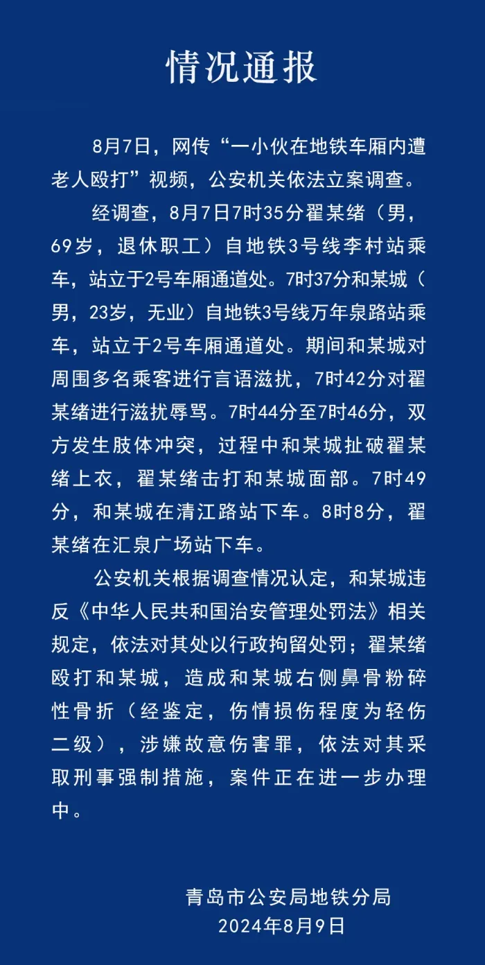 据“青岛地铁公安”微信公众号消息,8月9日,青岛市公安局地铁分局发布情况通报,8月7日,网传“一小伙在地铁车厢内遭老人殴打”视频,公安机关依法立案调查。