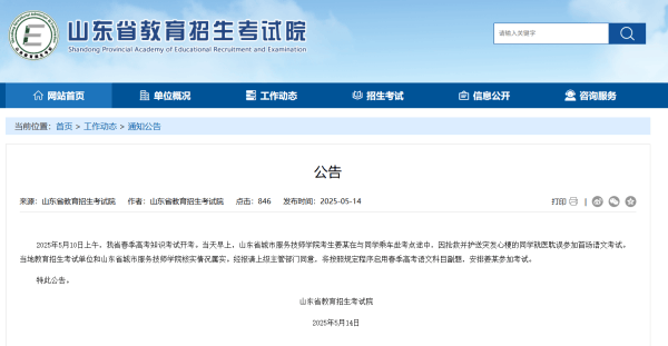 山东省教育招生考试院网站14日发布公告:考生姜某在与同学乘车赴考点途中,因抢救并护送突发心梗的同学就医耽误参加首场语文考试,将按照规定程序启用春季高考语文科目副题,安排姜某参加考试。