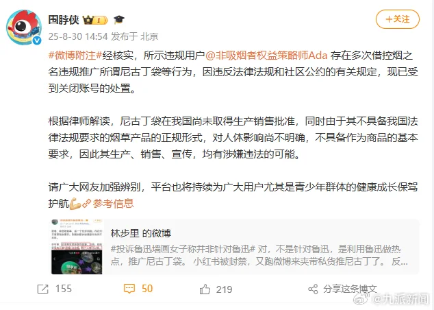 围脖侠:经核实,所示违规用户@非吸烟者权益策略师Ada 存在多次借控烟之名违规推广所谓尼古丁袋等行为,因违反法律法规和社区公约的有关规定,现已受到关闭账号的处置。