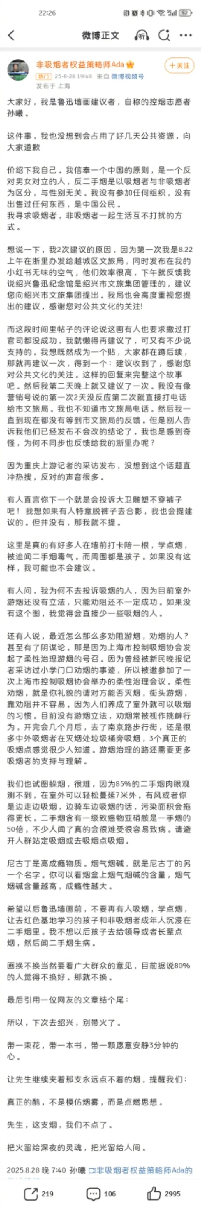 28日晚,投诉绍兴鲁迅纪念馆鲁迅夹烟墙画的当事人孙女士@非吸烟者权益策略师Ada 在微博发布长文回应事件,并为占用公共资源空间致歉。