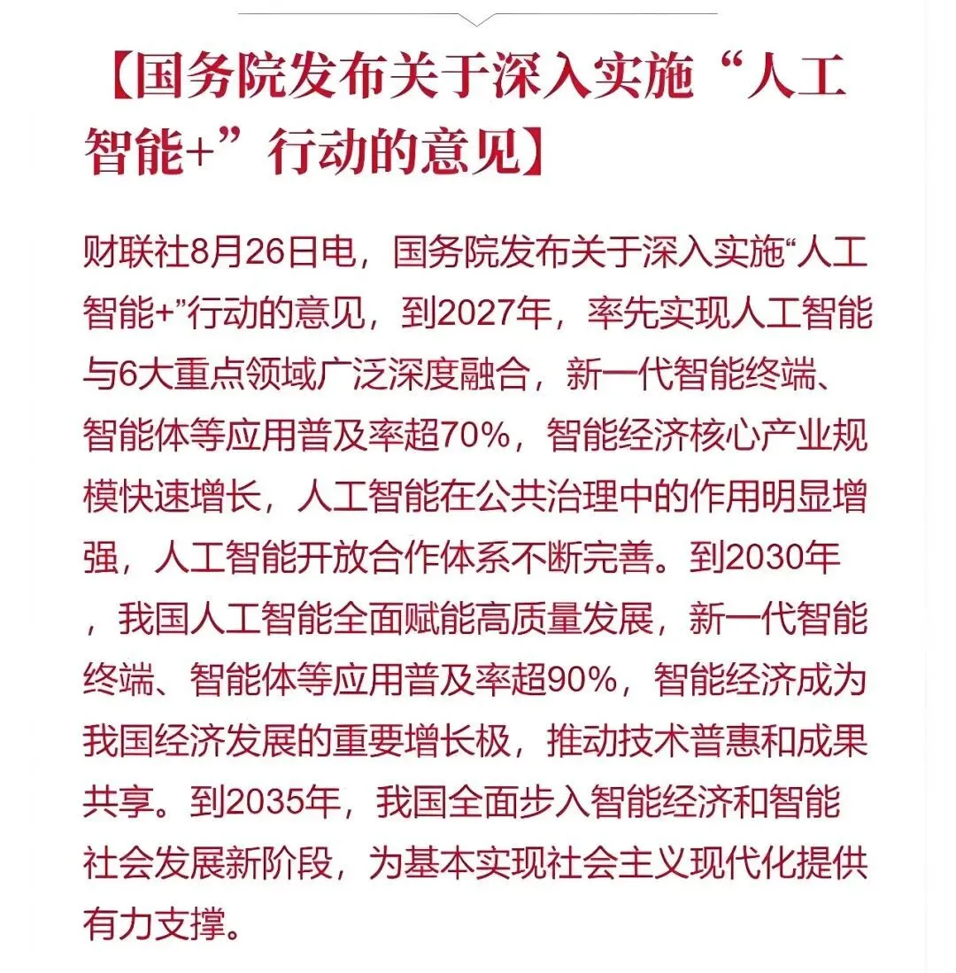 日前,国务院印发《关于深入实施“人工智能+”行动的意见》,提出“三步走”发展目标,2027年AI应用普及率超70%,2030年超90%,智能经济成为经济发展重要增长极,2035年全面步入智能经济和智能社会发展新阶段。