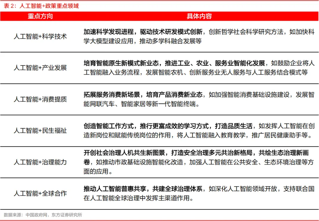 根据文件,“人工智能+”聚焦于六大行动,即AI+科学技术、+产业发展、+消费提质、+民生福祉、+治理能力、+全球合作,擘画出大规模应用的路线图。