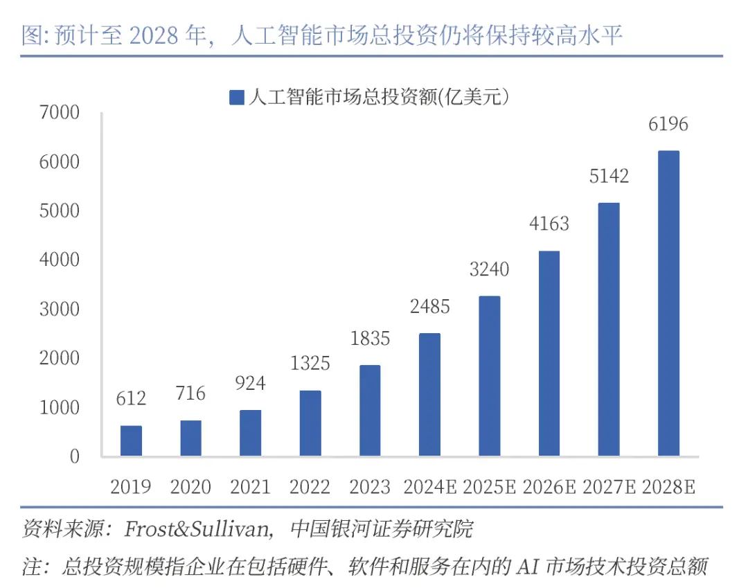 购机机构预测,2028年,全球AI支出将从2000多亿美元跃升到6000亿美元以上,年复合增长率为28%。