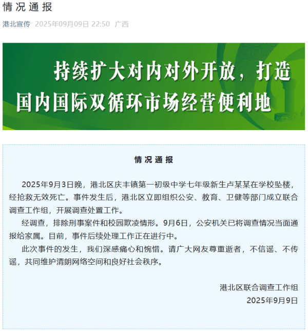 2025年9月3日晚,港北区庆丰镇第一初级中学七年级新生卢某某在学校坠楼,经抢救无效死亡。事件发生后,港北区立即组织公安、教育、卫健等部门成立联合调查工作组,开展调查处置工作。