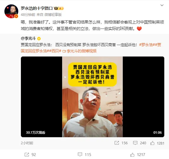 “一定会起诉,我们只能用法律武器。该起诉他起诉他,该不理他不理他,做好我们自己就行了。”贾国龙表示,按国家对预制菜的严格定义,西贝无一道菜属于预制菜。罗永浩 “西贝全是预制菜并说恶心” 的表述,不仅让人感觉不适、造成情感伤害,更对西贝商誉产生重大影响,涉嫌损害品牌形象。