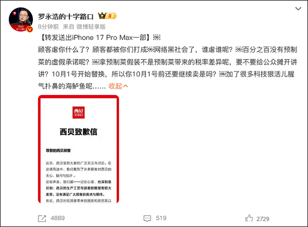 针对近期陷入预制菜舆论风波,9月15日,@西贝XIBEI官方微博发布“西贝致歉信”,称将于10月1日前完成中央厨房前置加工环节门店化等整改,并推行“打明牌、透明化经营”。西贝创始人贾国龙此前曾表示,公司将“彻底向胖东来学习”,接受公众监督。全文如下。