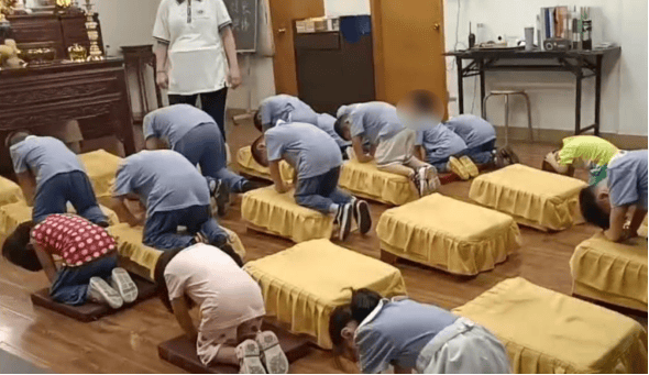 孩子们在幼儿园向“无生老母”等造像跪拜。图源:中国反邪教网