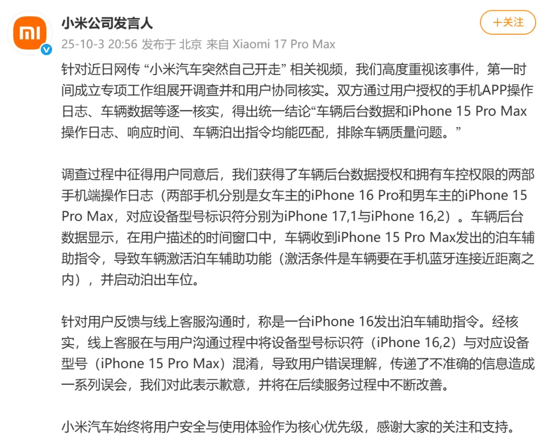 针对近日网传 “小米汽车突然自己开走” 相关视频,我们高度重视该事件,第一时间成立专项工作组展开调查并和用户协同核实。双方通过用户授权的手机APP操作日志、车辆数据等逐一核实,得出统一结论“车辆后台数据和iPhone 15 Pro Max操作日志、响应时间、车辆泊出指令均能匹配,排除车辆质量问题。”
