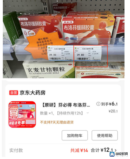 【芬必得】 布洛芬缓释胶囊(0.3g*12粒*2板/盒)线上最低12.1元,线下最高29.8元,差价17.7元