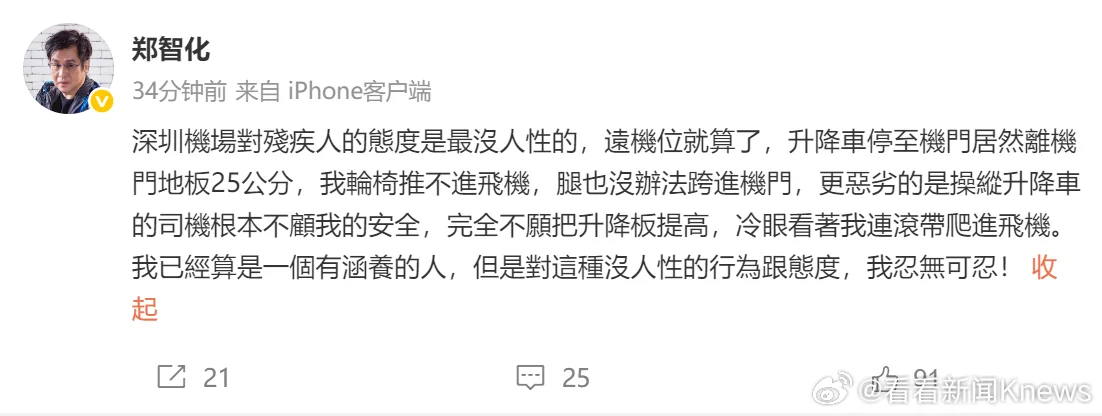 早前报道:郑智化发文斥深圳机场对残疾人没人性