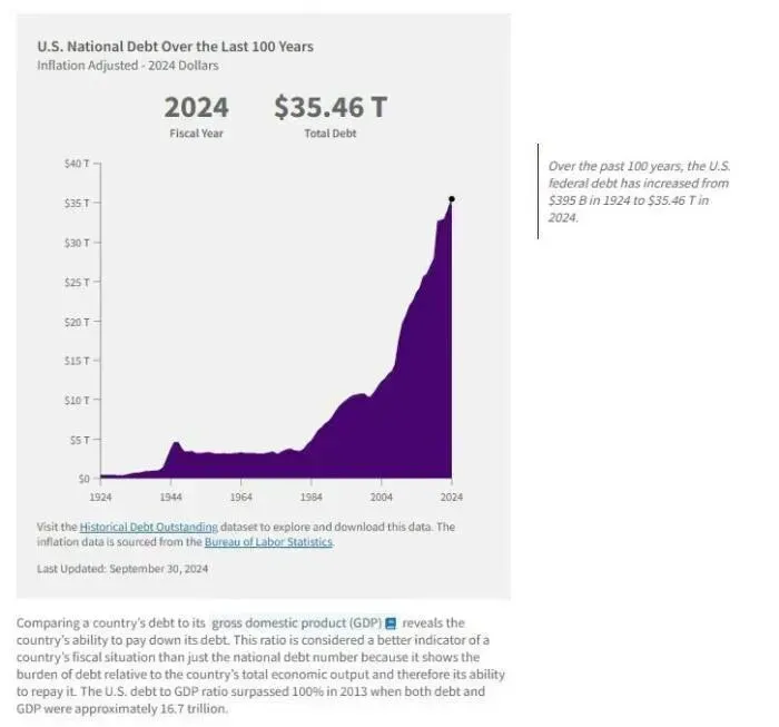 根据美国政府公开的数据,自2008年起美债规模就保持着惊人的扩张速度,2017年突破20万亿美元,2024年突破35万亿,最近一年间又快速飙升至37万亿。这一数额相当于2024年美国名义国内生产总值的1.27倍。